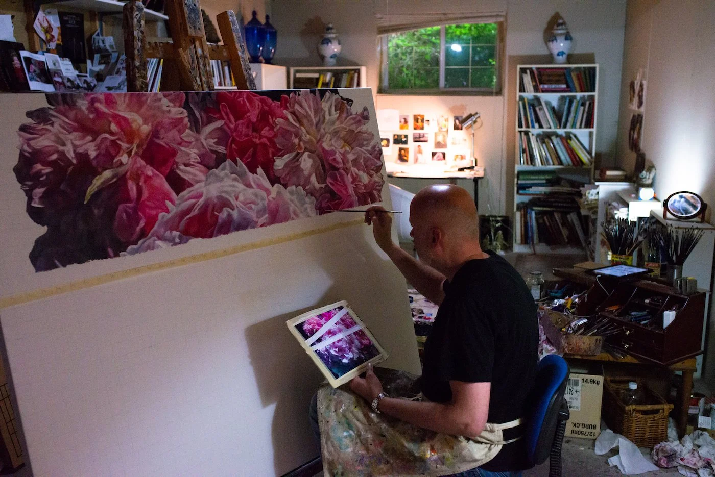 I’ve never had an elaborate space to work in but it’s a space that works for me. It’s in my home, which means the commute time in the morning is about 30 seconds. In the summer I’m particularly glad for this arrangement. I can take a break from the painting and take photos of flowers from our front yard garden. For some artists, the separation of their studio is important, but for me the opposite has always been true. I like the above quotation, too, because I think my work reflects what I need, flowers, and I think my work in turn gives the world something that it needs.